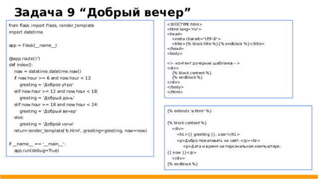 = 6 and now.hour greeting = 'Доброе утро' elif now.hour = 12 and now.hour {% block content %} {% endblock %} greeting = 'Добрый день' elif now.hour = 18 and now.hour greeting = 'Добрый вечер' else: greeting = 'Доброй ночи' return render_template('b.html', greeting=greeting, now=now) if __name__ == '__main__': app.run(debug=True) {% extends 'a.html' %} {% block content %} {{ greeting }}, user! Добро пожаловать на сайт. Дата и время на персональном компьютере: {{ now }} {% endblock %}" width="640"