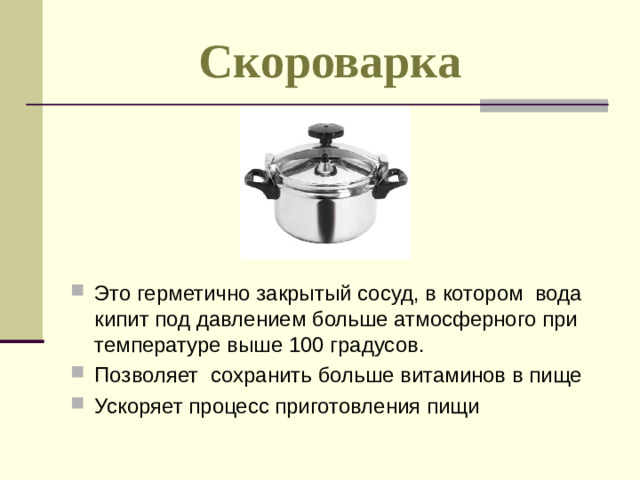 - Это герметично закрытый сосуд, в котором вода кипит под давлением больше атмосферного при температуре выше 100 градусов.