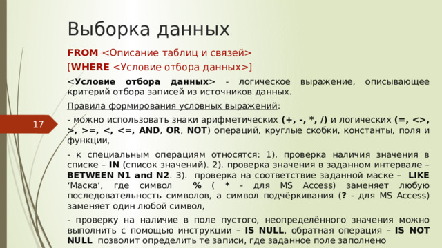 - к специальным операциям относятся: 1). проверка наличия значения в списке – IN (список значений). 2). проверка значения в заданном интервале – BETWEEN N1 and N2 . 3). проверка на соответствие заданной маске – LIKE ‘Маска’, где символ % ( * - для MS Access) заменяет любую последовательность символов, а символ подчёркивания ( ? - для MS Access) заменяет один любой символ,