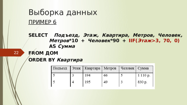 3, 70, 0) AS Сумма FROM ДОМ ORDER BY Квартира" width="640"
