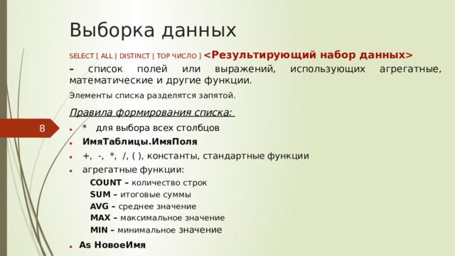 – список полей или выражений, использующих агрегатные, математические и другие функции. Элементы списка разделятся запятой. Правила формирования списка: * для выбора всех столбцов ИмяТаблицы.ИмяПоля +, -, *, /, ( ), константы, стандартные функции агрегатные функции: COUNT – количество строк SUM – итоговые суммы AVG – среднее значение MAX – максимальное значение MIN – минимальное значение As НовоеИмя" width="640"