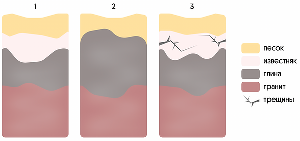 1. На участках 1 и 3 близко к поверхности залегают легкорастворимые карстующиеся породы (известняки)