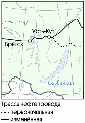 "В 2006 году начато строительство нового нефтепровода “Восточная Сибирь – Тихий океан”. При его строительстве будут использоваться новейшие технологии, призванные обеспечить надёжность его эксплуатации в условиях низких температур и вечной мерзлоты. Против укладки трассы нефтепровода в непосредственной близости от озера Байкал возражали учёные-экологи, которые говорили о неизбежности экологической катастрофы в случае аварии на будущем нефтепроводе. Под их влиянием было принято решение от изменении трассы трубопровода".