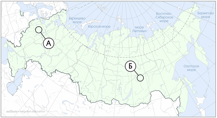 10. Территории, обозначенные на карте буквами А и Б, расположены примерно на одной широте. Объясните, почему на территории Б, в отличие от территории А, широко распространена многолетняя мерзлота. Укажите две причины.
