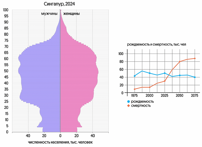 19. В 2024 г. численность населения Сингапура составляла 6,323 млн человек, рождаемость – 8,6%, смертность – 5,8%. При этом значение суммарного коэффициента рождаемости (количество новорожденных приходящихся на одну женщину в детородном (от 15 по 49 лет) возрасте) составляло 1,2. Ниже приводится половозрастная пирамида Сингапура в 2024 г. и график прогнозируемых изменений рождаемости и смертности.