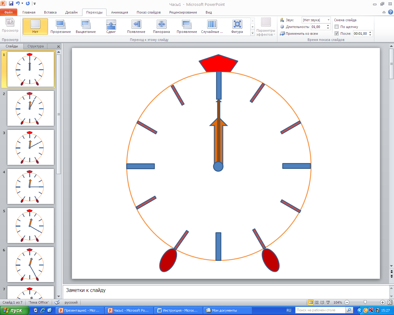 Внесите изменения в положение стрелок на слайдах, так чтобы на них последовательно отмечалось время: 12.05; 12.10; 12.15; 12.20; 12.25; 12.30. Правила поворота смотрите в п.5.