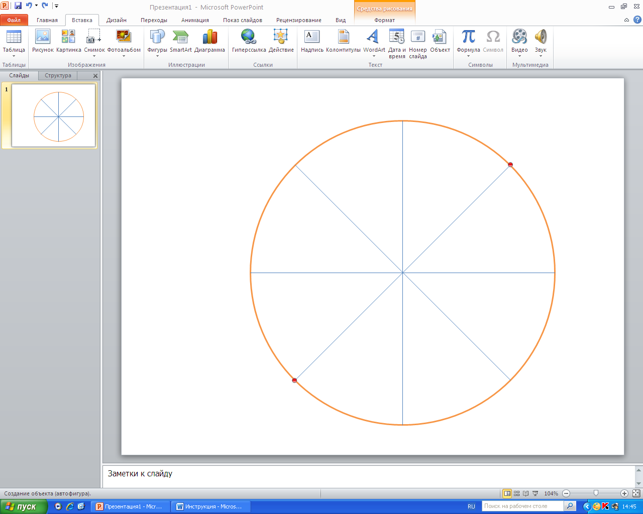 Меню «Вставка» - Фигуры – Линии (Изобразить 4 линии между красными точками на круге)