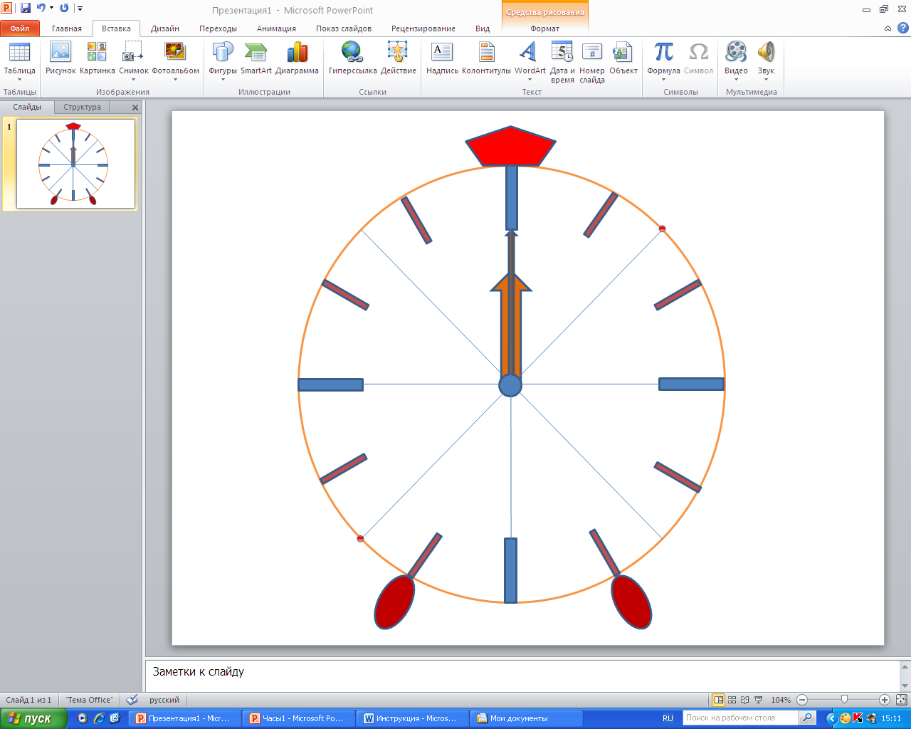Меню «Вставка» - Фигуры – Прямоугольник, правильный пятиугольник, стрелка вверх, овал (Изобразите циферблат со стрелками, ножки и верхнюю кнопку). Чтобы настроить цвет заливки фигуры, нужно выделить данную фигуру, далее Меню «Формат» - Заливка фигуры. Чтобы повернуть прямоугольник разметки циферблата, нужно выделить данный прямоугольник, далее Меню «Формат» - Повернуть – Другие параметры поворота