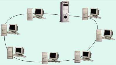 В сетях с топологией «кольцо» файл-сервер и рабочие станции соединены кабелем в кольцо. Сообщения рабочей станции могут проходить через несколько других рабочих станций до того, как они достигнут файл-сервера.