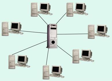 Сеть с выделенным сервером. Это когда в сети существует центральный компьютер – сервер, с него происходит управление работой в сети. Остальные компьютеры сети называются рабочими станциями и их доступ к информации полностью зависит от сервера.