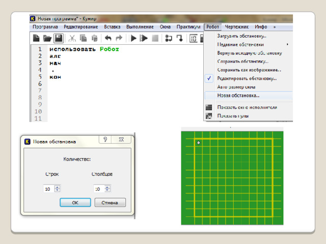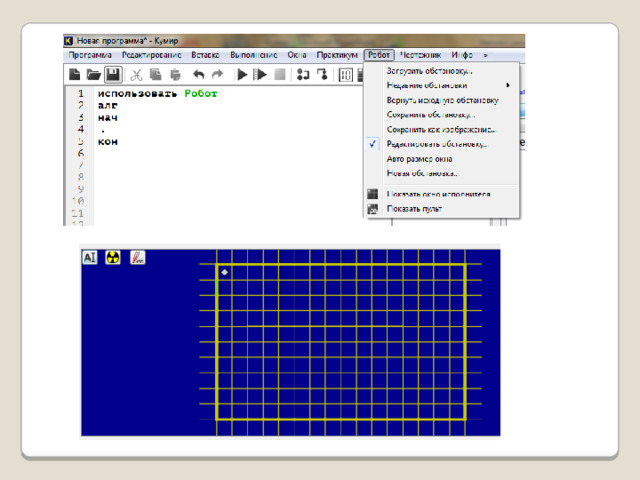 - Напишите программу, чтобы Робот начинал движение с центра поля 11х11 и закрасил 8 клеток вокруг центра поля и вернулся в центр поля. Обстановку сохранить и сдать вместе с программой (Фамилия_обст2 и Фамилия_прог2).
